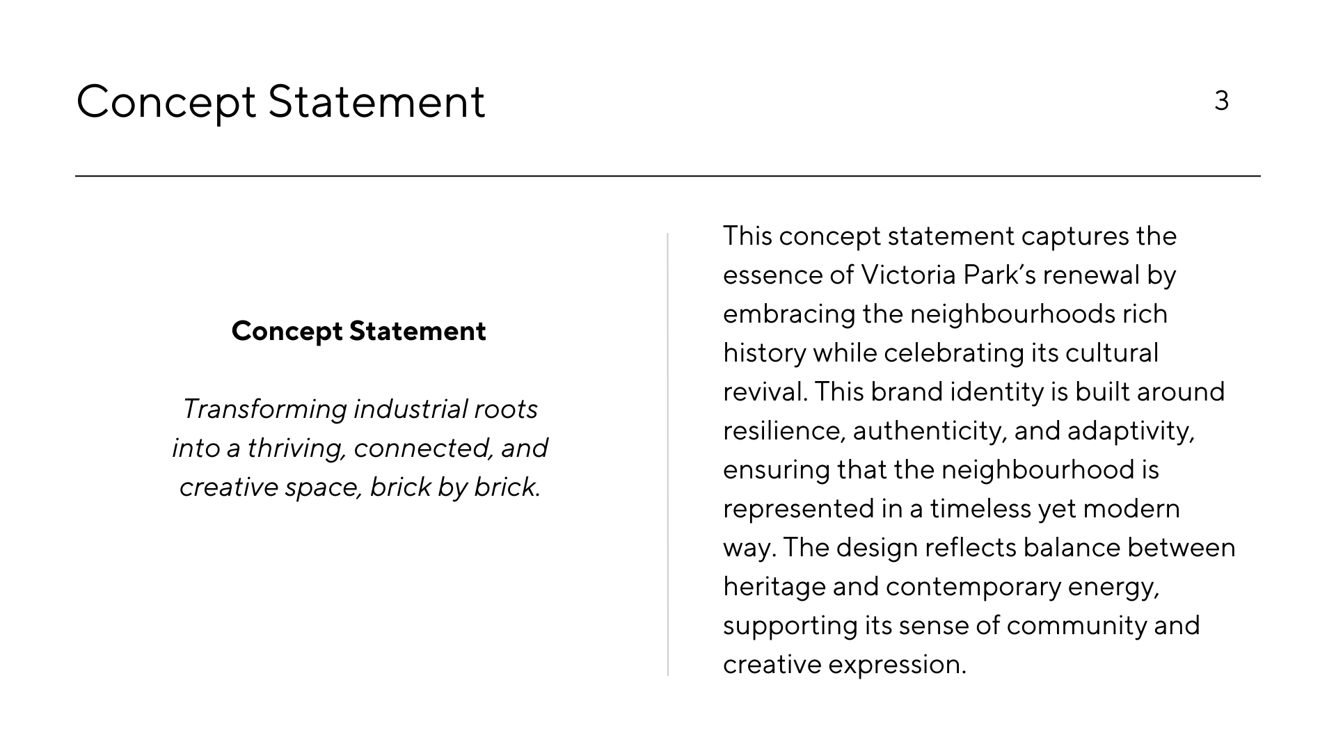 Using insights from ethnographic and visual research, I developed a cohesive visual identity system for Victoria Park that reflects its transformation from industrial roots into a thriving, connected, and creative neighbourhood.