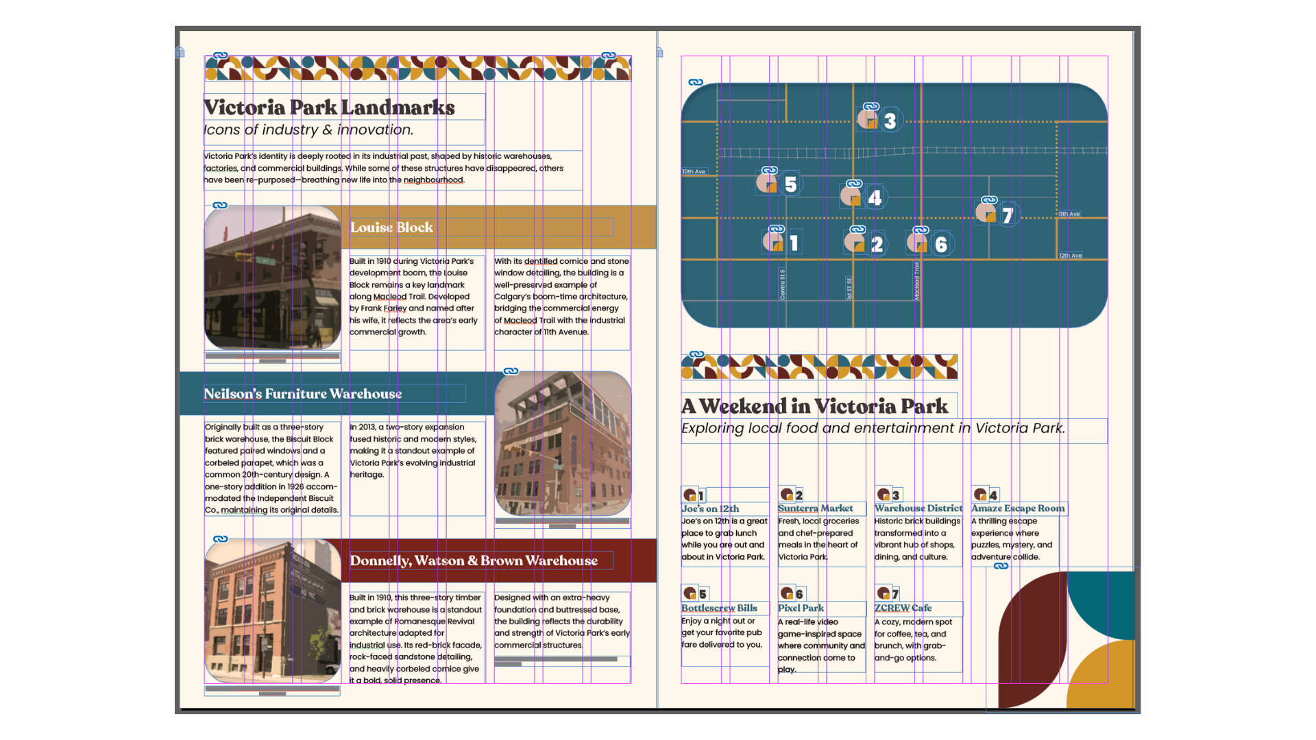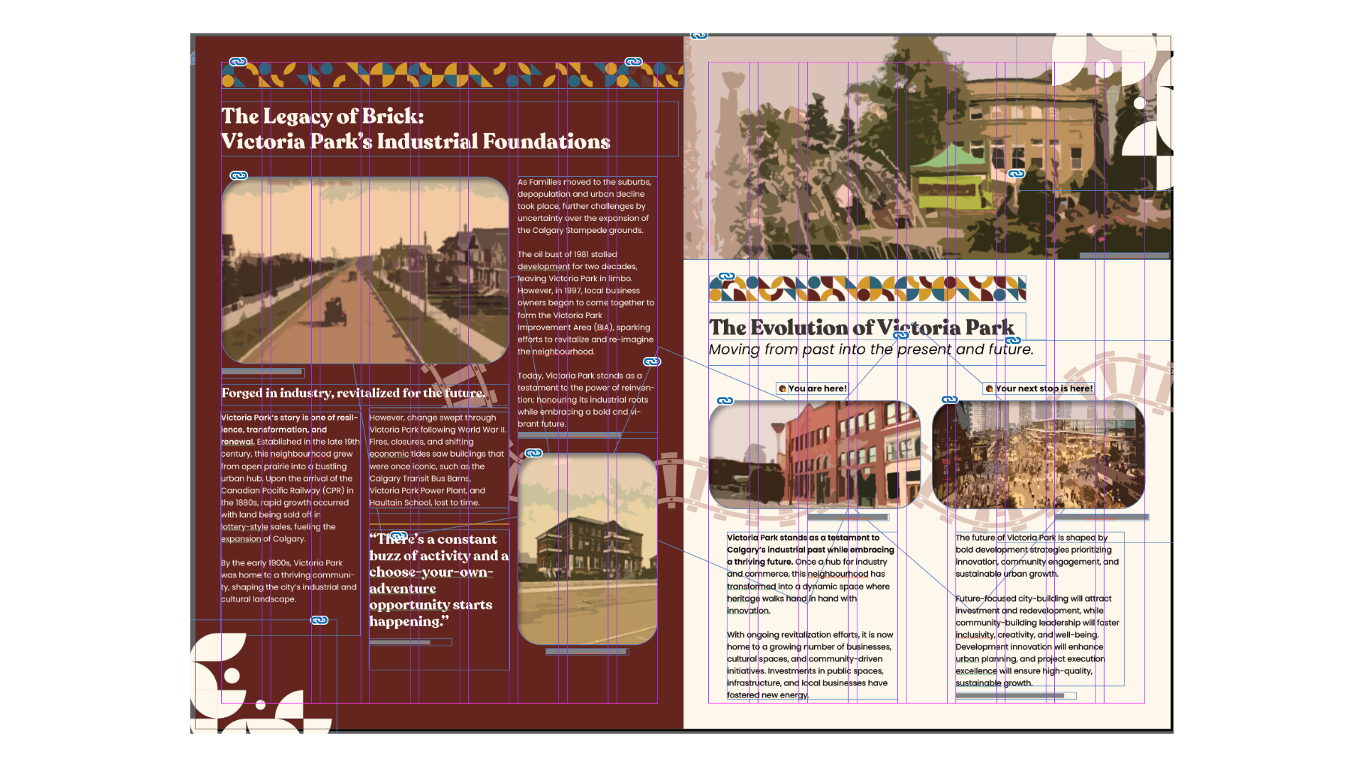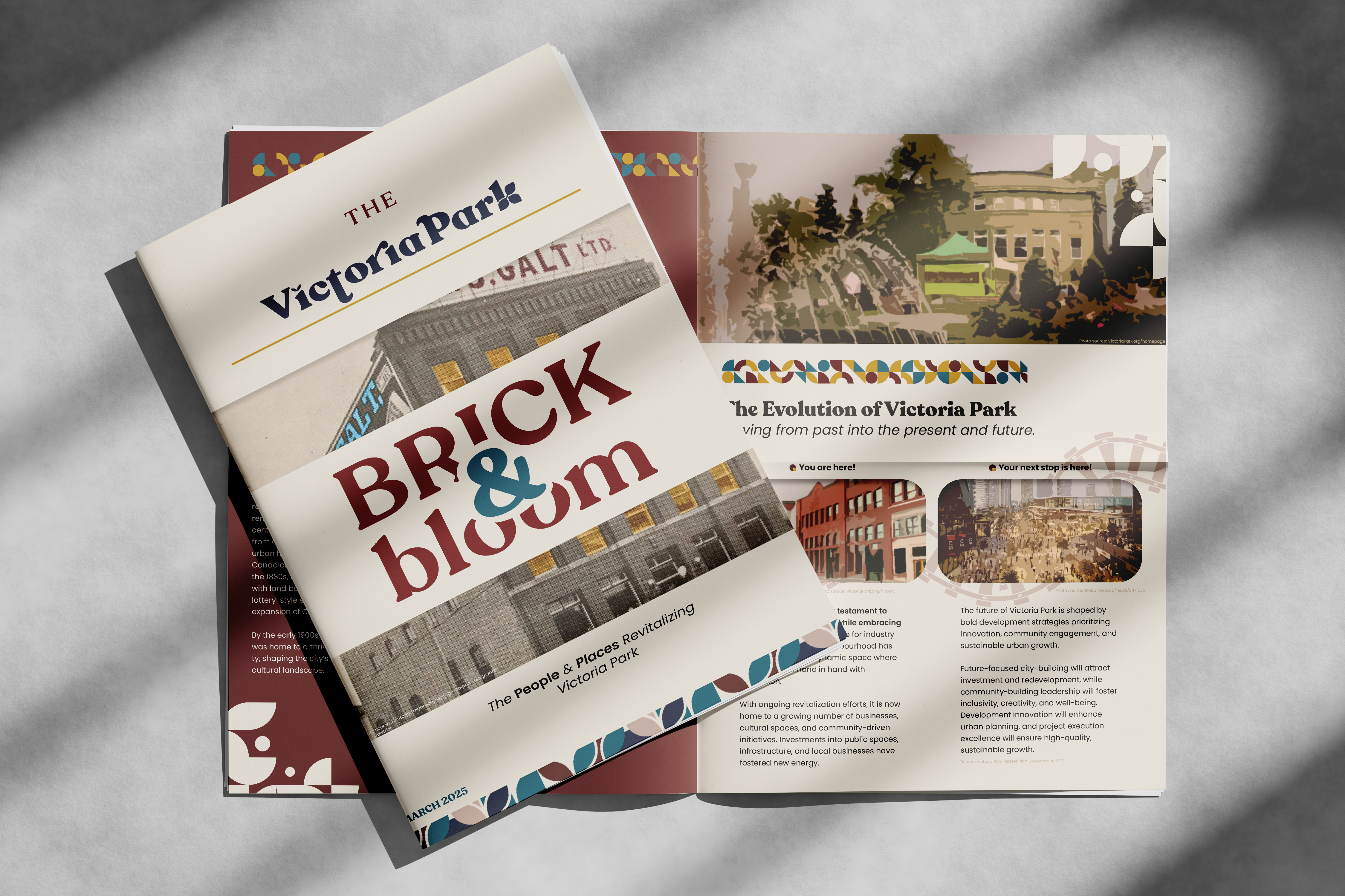 In this individual project, I developed a cohesive visual identity system for Victoria Park and applied it across print and digital formats, including a community newsletter, website mockup, and infographic poster—highlighting the neighbourhood’s history, culture, and revitalization.