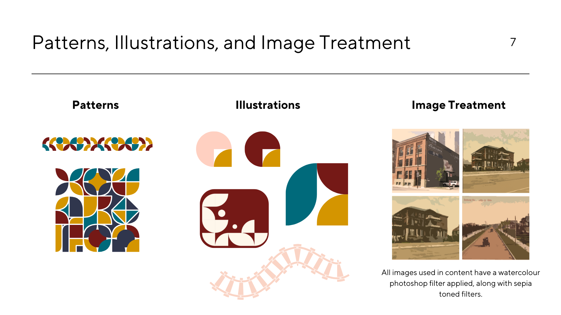 Graphic Language: Botanical illustrations, geometric patterns, and a sepia-toned image treatment reflect the area’s ongoing growth and layered identity