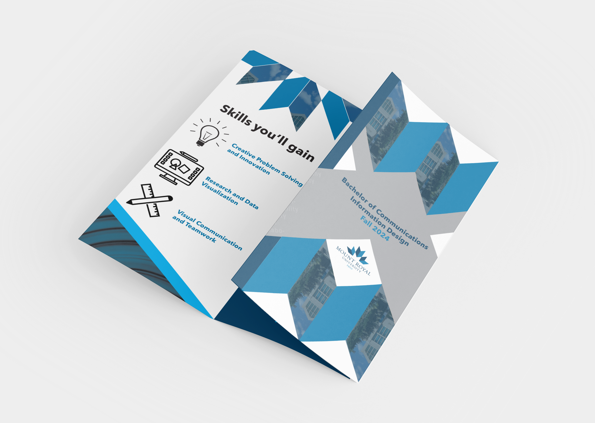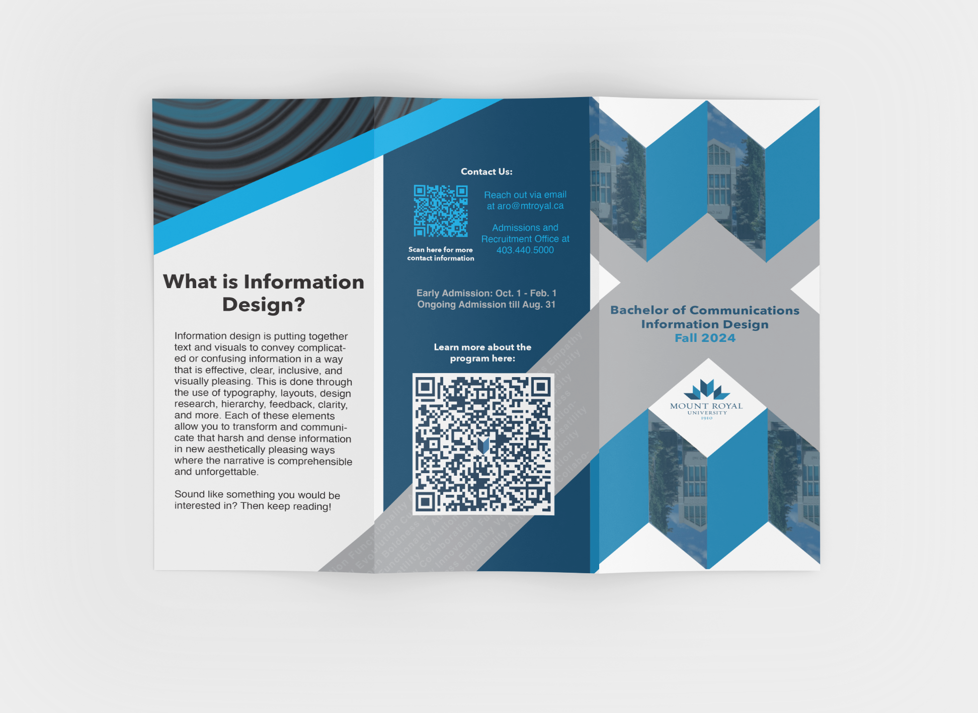 In this project, I designed an information brochure for Mount Royal University’s Information Design program, aiming to connect with open studies students exploring their academic options. The project focused on applying principles of typography, layout, and audience-centered design.