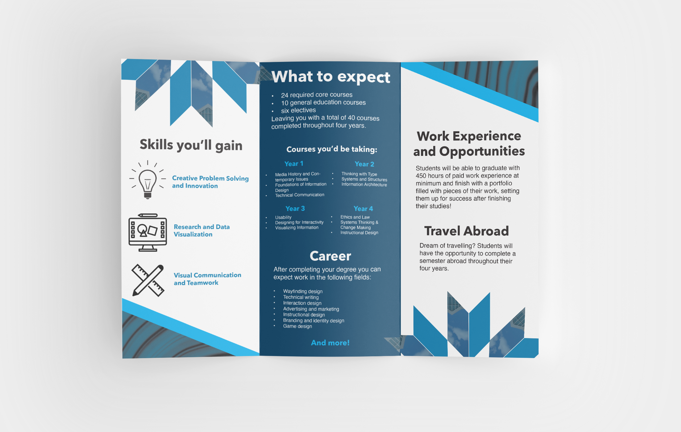 To make my brochure informative yet visually compelling, I relied on layout principles, particularly hierarchy and grid systems. Hierarchy helped prioritize key messages, guiding readers from the program definition down to opportunities like study abroad, careers, and course requirements. The grid layout helped place each element with precision, creating a balanced, symmetrical design. By giving each section a clear place, I could make critical information easy to navigate, ensuring students knew exactly where to find the details they’d need to make an informed decision.