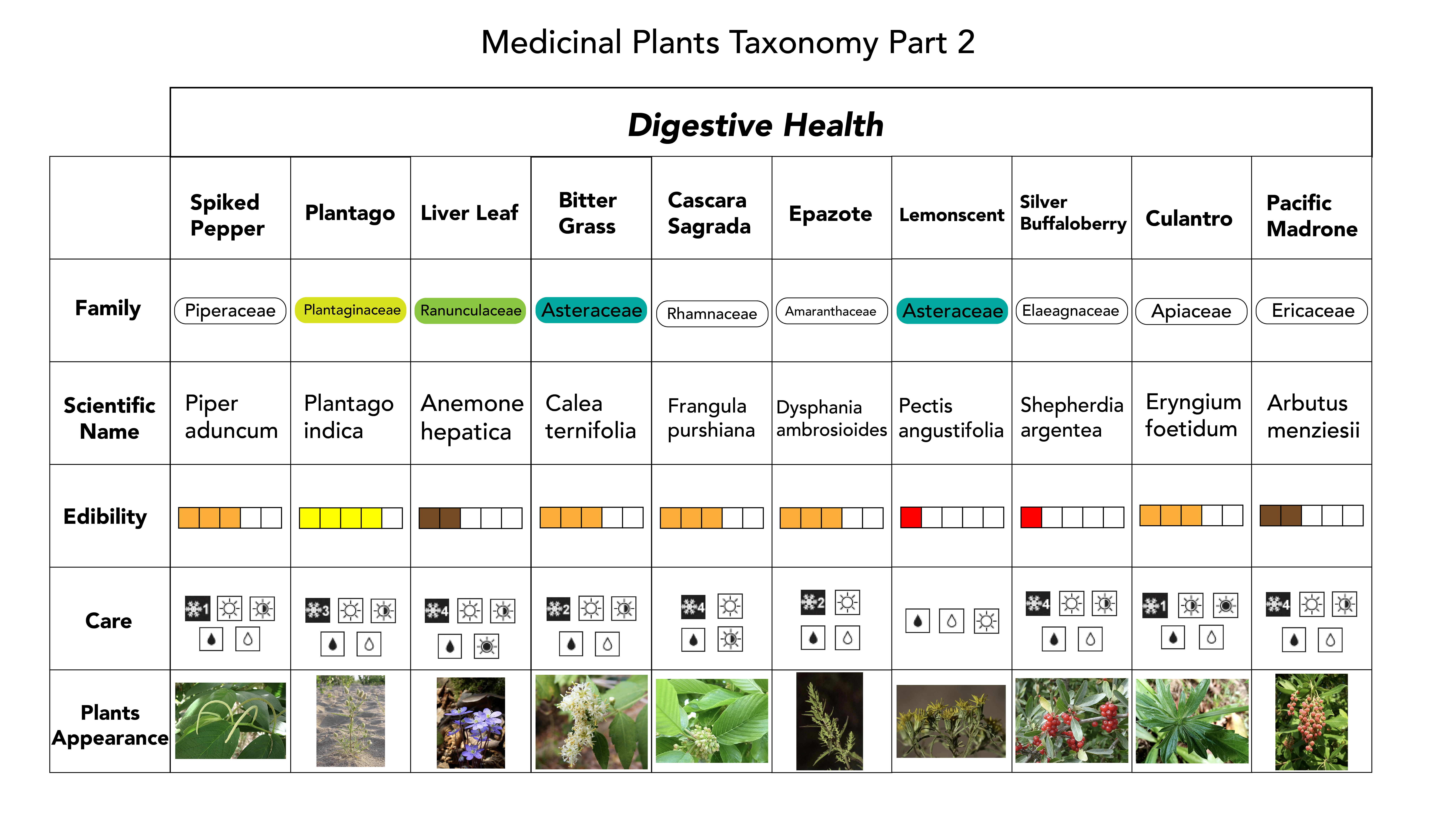 For my dataset, I chose medicinal plants native to North America. Starting with a list of around 100 species, I refined the list down to 50 based on clear healing uses and available care information. I created a taxonomy using eight health-related categories such as Immune Support, Skin Health, and Nervous System Support. I also developed key facets for each plant: scientific/common names, medicinal rating (1–5), plant form, and care needs (sunlight, soil, and temperature). This structure laid the groundwork for a visually navigable and comparable system.